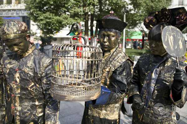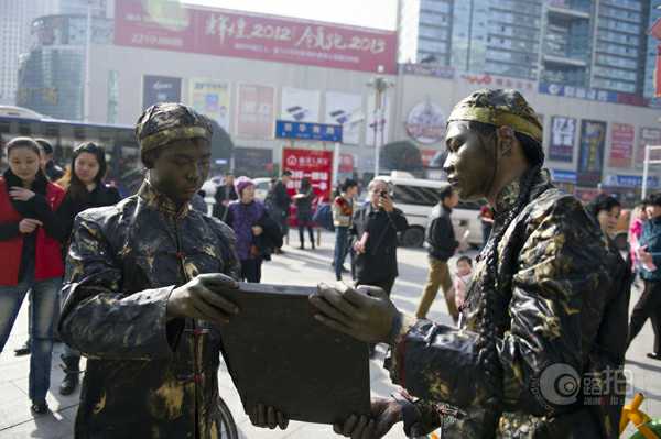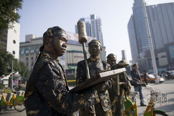 株洲市民在路過株洲市中心廣場電信大樓前坪時看到這些雕塑,以為時下流行的穿越劇情降臨株洲,摸一摸,才敢確信這些雕塑是真人版。