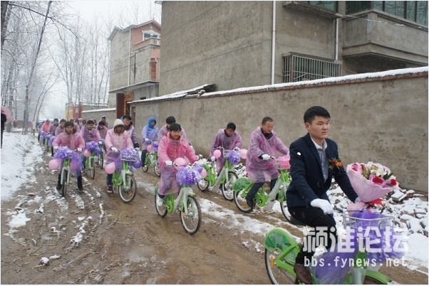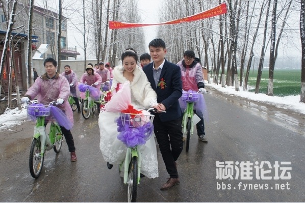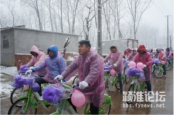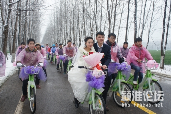 30輛公共自行車整齊碼開,時云濤“打頭陣”騎在最前面,后面時云濤的親朋好友們,四人一排,整齊劃一。因?yàn)橐恢痹谙麓笱吕傻募胰诉€特別貼心的為騎自行車的人們準(zhǔn)備了防寒的手套和粉色的雨衣,穿著小粉,騎著小綠,浩浩蕩蕩去新娘家迎親去,一支騎著公共自行車的婚車隊(duì)伍“招搖過街”也是賺足了回頭率,有不少路人駐足觀看,沿街接受路人的祝福,再配上這漫天大雪,簡直太浪漫了。新娘閆瑞金告訴記者:“時云濤平時在生活中就是一個非常浪漫的人,兩人在談戀愛時就經(jīng)常會想出許多有創(chuàng)意的點(diǎn)子我開心,這次用公共自行車來迎親也是讓我非常意外,而且也非常有紀(jì)念意義,我相信這個婚禮會讓我終身難忘。外面一直在下雪,我也非常感動,他也和迎親隊(duì)伍一路騎車過來,相信我們以后一定會幸福到永遠(yuǎn)?!?/p>