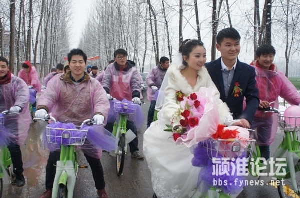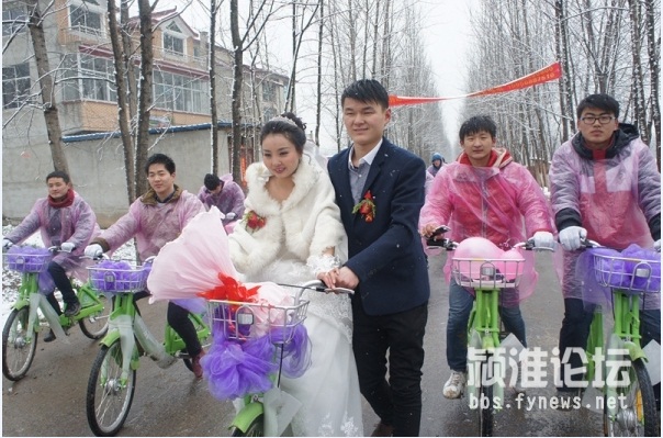 時云濤是一名年輕的90后,在阜陽臨沂商城從事門業(yè)生意。新娘名叫閆瑞金,是行流鎮(zhèn)高橋村人,新娘和新郎是高中同學(xué),兩人戀愛至今已經(jīng)走過了四五個年頭,大學(xué)期間兩人分隔兩地,新郎時云濤在大一時退學(xué)回家創(chuàng)業(yè),自主創(chuàng)業(yè)生意也是越來越紅火,事業(yè)有成接下來就要抱得美人歸了,結(jié)婚無疑是一件人生大事,這結(jié)婚就是要結(jié)的與眾不同,什么樣的結(jié)婚形式才能更別出心裁呢,時云濤在采辦結(jié)婚用品的時候,碰巧看見了停放在臨沂商城附近的公共自行車,時云濤就想如果用公共自行車當(dāng)婚車,不僅節(jié)能環(huán)保,而且整齊劃一,想想那齊刷刷排整齊的自行車迎親隊(duì)伍,效果應(yīng)該是不一般的吸引眼球吧,于是這個創(chuàng)意婚禮的念頭就這樣應(yīng)運(yùn)而生。