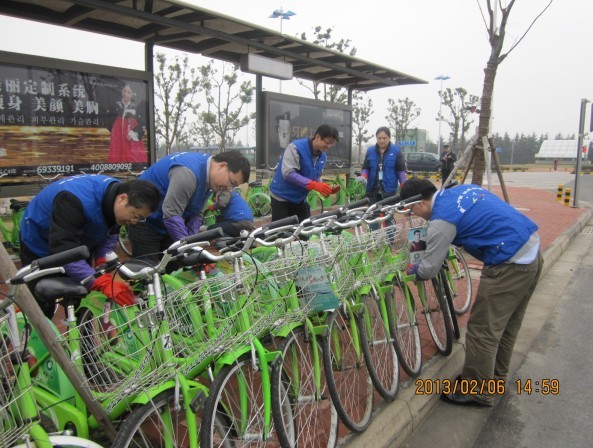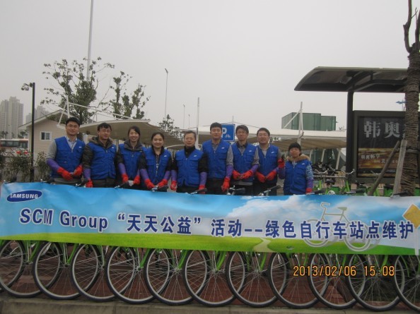 在活動現(xiàn)場有些自行車需要調(diào)整零件的,懂自行車維護(hù)的同志就自告奮勇的站出來擔(dān)當(dāng)這個(gè)任務(wù),有些自行車需要清潔工作的,就拿起抹布認(rèn)真仔細(xì)地擦試,不一會兒工夫一個(gè)又一個(gè)站點(diǎn)在他們熟練的動作中形成一道道美麗的風(fēng)景線。三星顯示器有限公司率先從自身做起,將環(huán)保理念深入員工帶動市民,以實(shí)際行動支持環(huán)保事業(yè)。