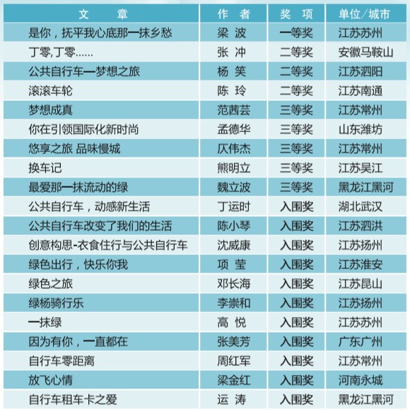 2014年5月底,常州永安公共自行車系統(tǒng)股份有限公司發(fā)布了“衣食住行與公共自行車”有獎(jiǎng)?wù)魑拇筚悾鞲鍟r(shí)間僅短短兩個(gè)月,社會各界和公司上下熱烈響應(yīng),踴躍投稿。截止至7月底,我們一共收到征文投稿70多篇,有歌頌綠色出行的篇章,有弘揚(yáng)低碳環(huán)保的詩文,有仰望永安夢想之旅的贊歌。經(jīng)過初步篩選,根據(jù)征文大賽的評選要求,邀請專業(yè)評委組進(jìn)行最終評審,評選出一等獎(jiǎng)1名,二等獎(jiǎng)3名,三等獎(jiǎng)5名,入圍獎(jiǎng)11名。現(xiàn)予以公布,詳見附圖。