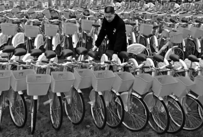 嘉興市體育中心的公共自行車登記辦理處,工作人員正在整理500多輛新自行車。