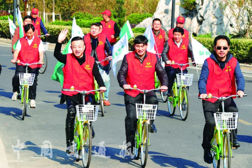 日前,江蘇省張家港市永聯(lián)村公共自行車(chē)系統(tǒng)投入使用,村域面積為10.5平方公里、被稱(chēng)為“華夏第一鋼村”的永聯(lián)村成為全國(guó)首個(gè)啟用公共自行車(chē)系統(tǒng)的建制村。一些明星也來(lái)到村里騎行公共自行車(chē),共同宣傳低碳環(huán)保的出行理念(如圖)。永聯(lián)村公共自行車(chē)一期設(shè)立17個(gè)租借點(diǎn),安裝鎖車(chē)器500個(gè),投放公共自行車(chē)400輛。